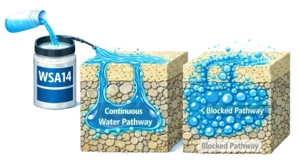 WSA14 rapidly disrupts continuous water pathways and reduces hydraulic conductivity.