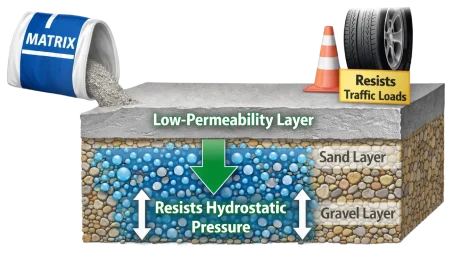 The MATRIX dry blend forms a cementitious, low permeability structural layer that resists hydrostatic pressure and traffic loads.